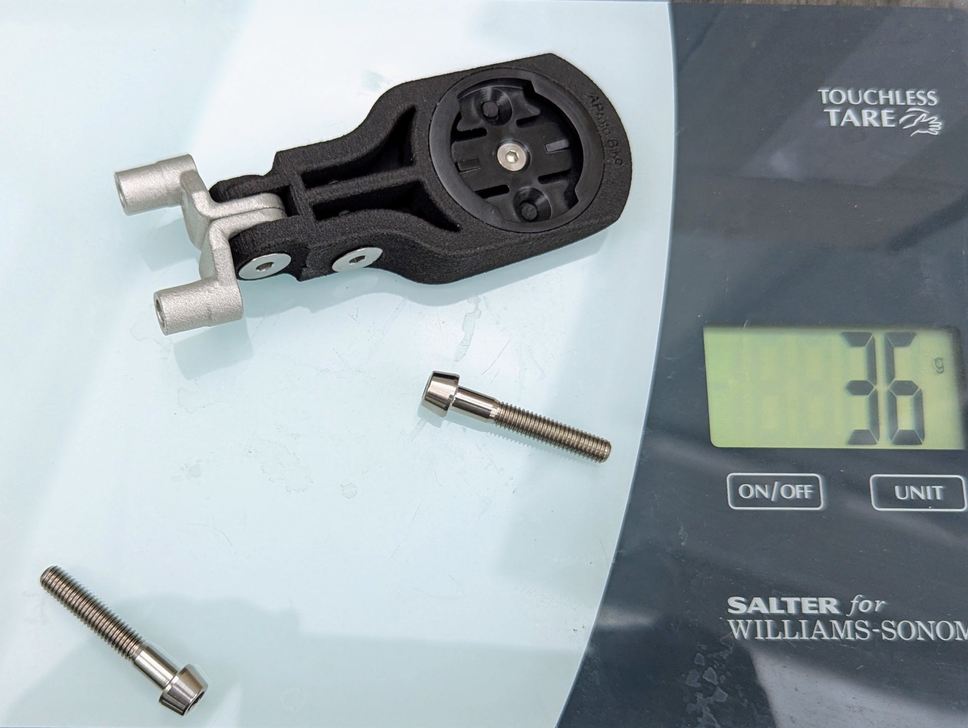 There are two different M5 bolt kits available for this mount, one made using 18-8 stainless bolts and another using 6/4 (Grade 5) Titanium bolts. The weight of the mount using the stainless bolts is ~43-47g and is ~34-38g